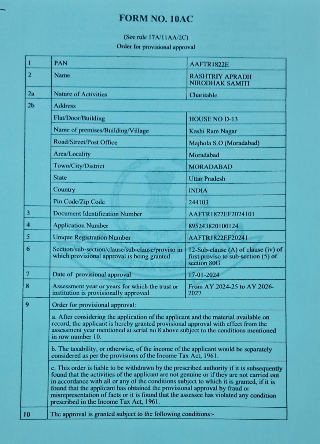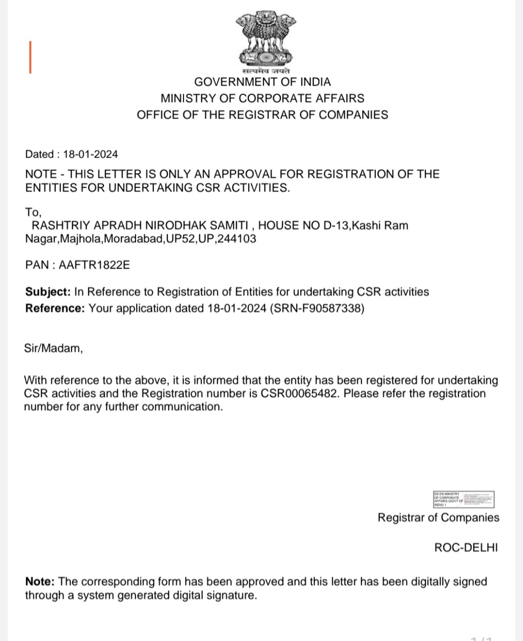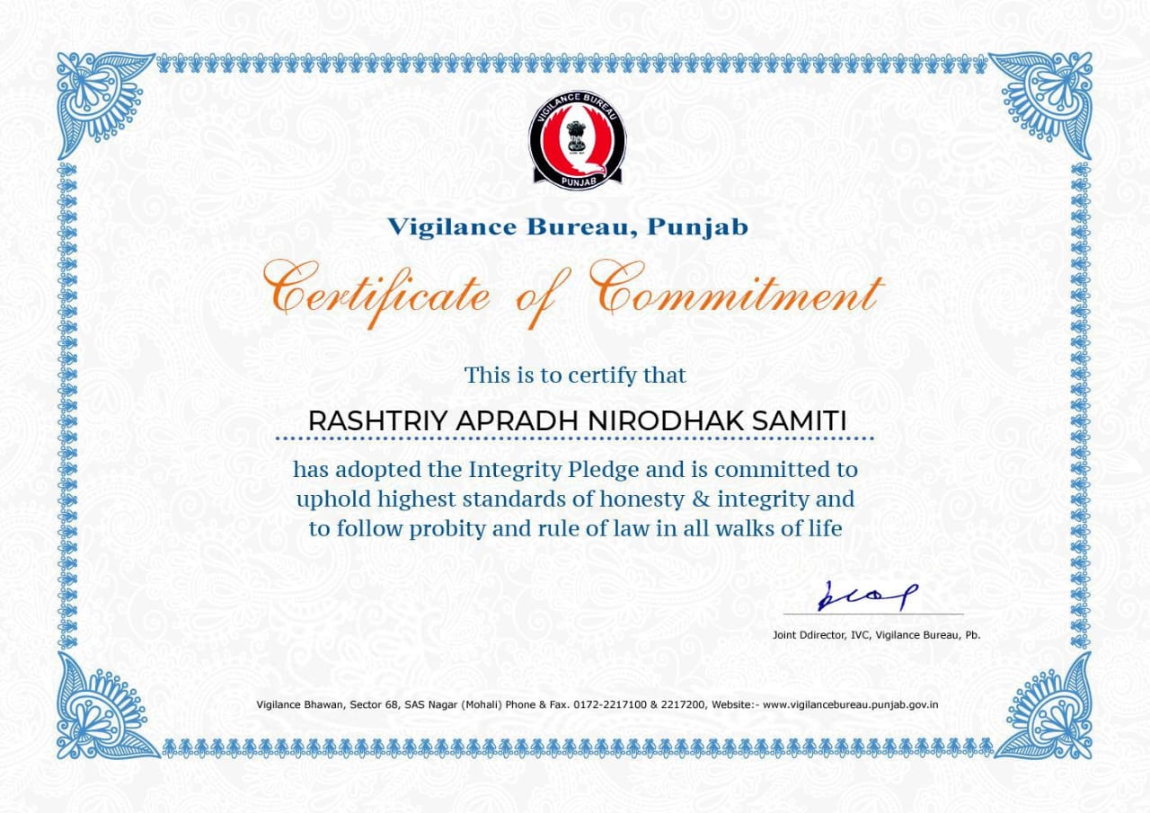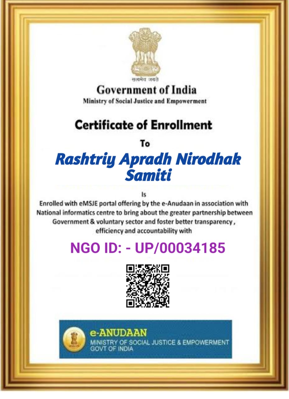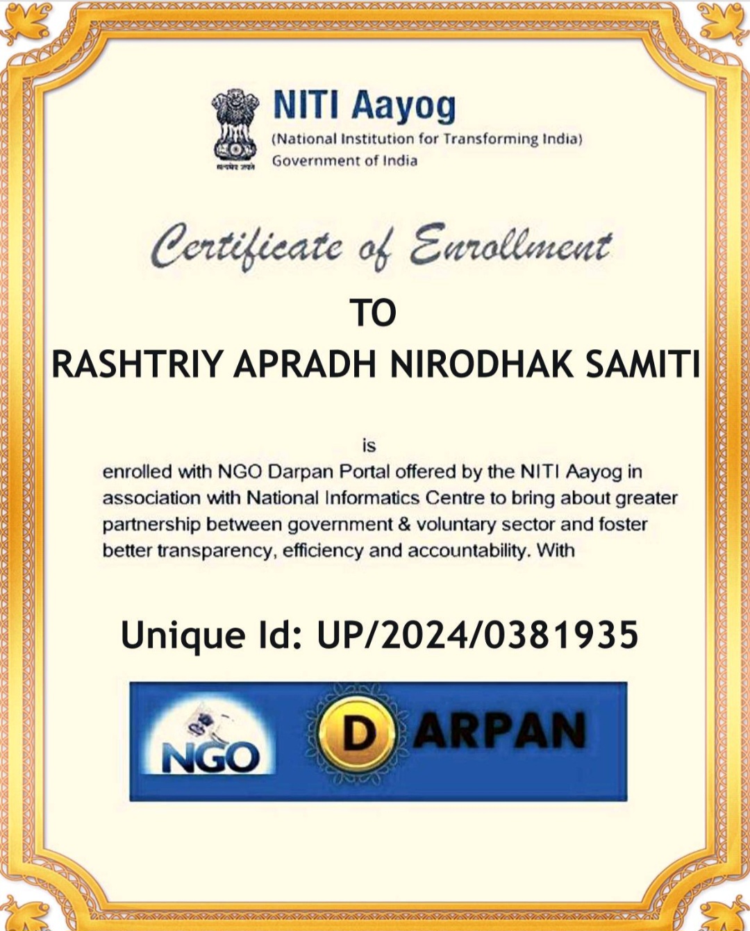 राष्ट्रीय अपराध निरोधक समिति का परिचय राष्ट्रीय अपराध निरोधक समिति संबंध : सामाजिक न्याय एवं अधिकारिता मंत्रालय भारत सरकार , नीति आयोग भारत सरकार, एम एस एम ई भारत सरकार , सी एस आर (1) भारत सरकार , आइ एस ओ सर्टिफाइड ISO9001:2015, Established under the Acts Of Government Of India) I.T.A. के द्वारा संचालित, आयकर अधिनियम १९६१ की धारा 80 जी (G) सहपाठित धारा 293 C नियम 11AA के अधीन छुट एवं धारा 12 ए के अधीन न्यास संस्था छुट देश में अपराध की रोकथाम के लिए कार्य करती है। इसका मुख्य उद्देश्य नागरिकों को सुरक्षा प्रदान करना, पुलिस व अन्य कानून प्रवर्तन एजेंसियों के साथ समन्वय स्थापित करना और अपराधों के खिलाफ निवारक उपायों को लागू करना है।