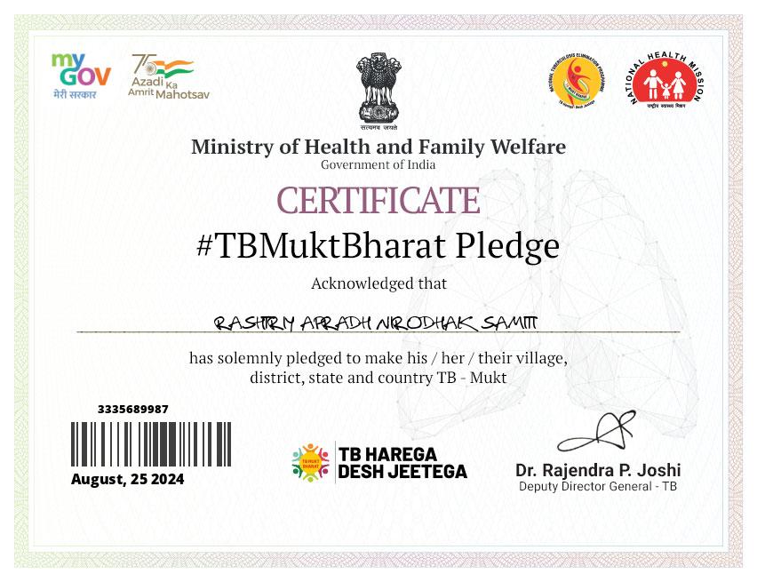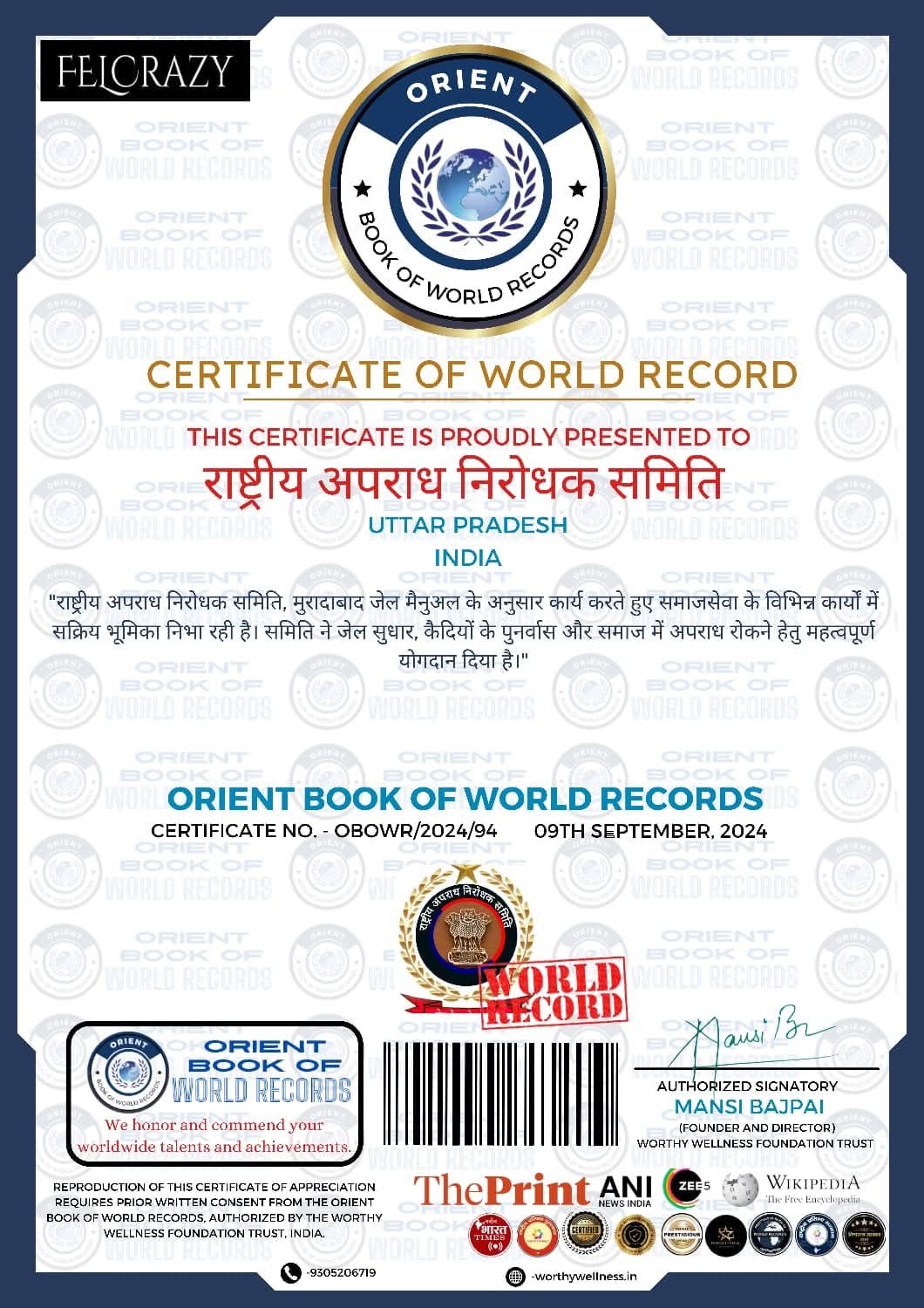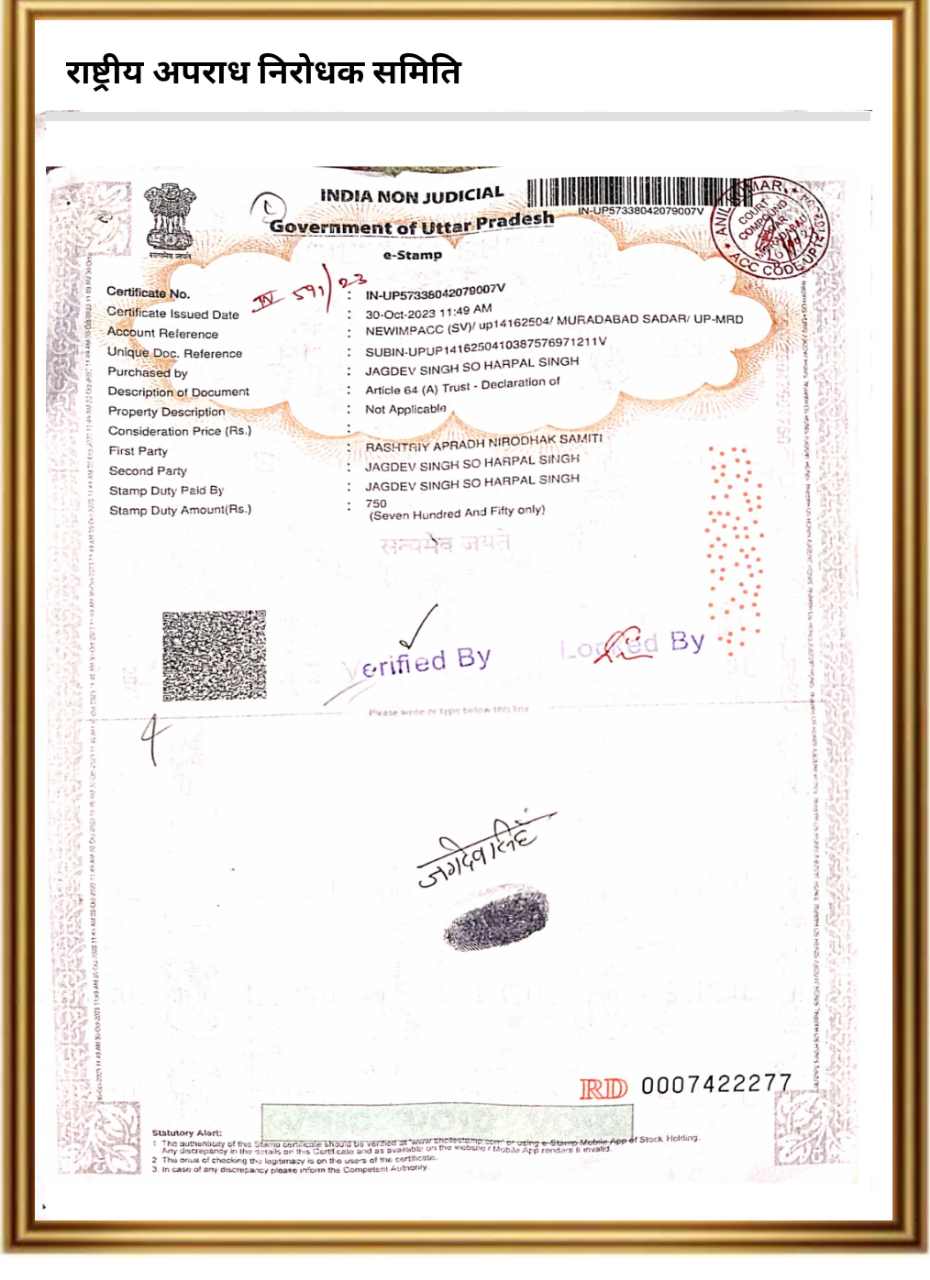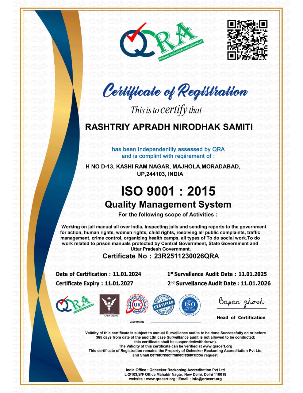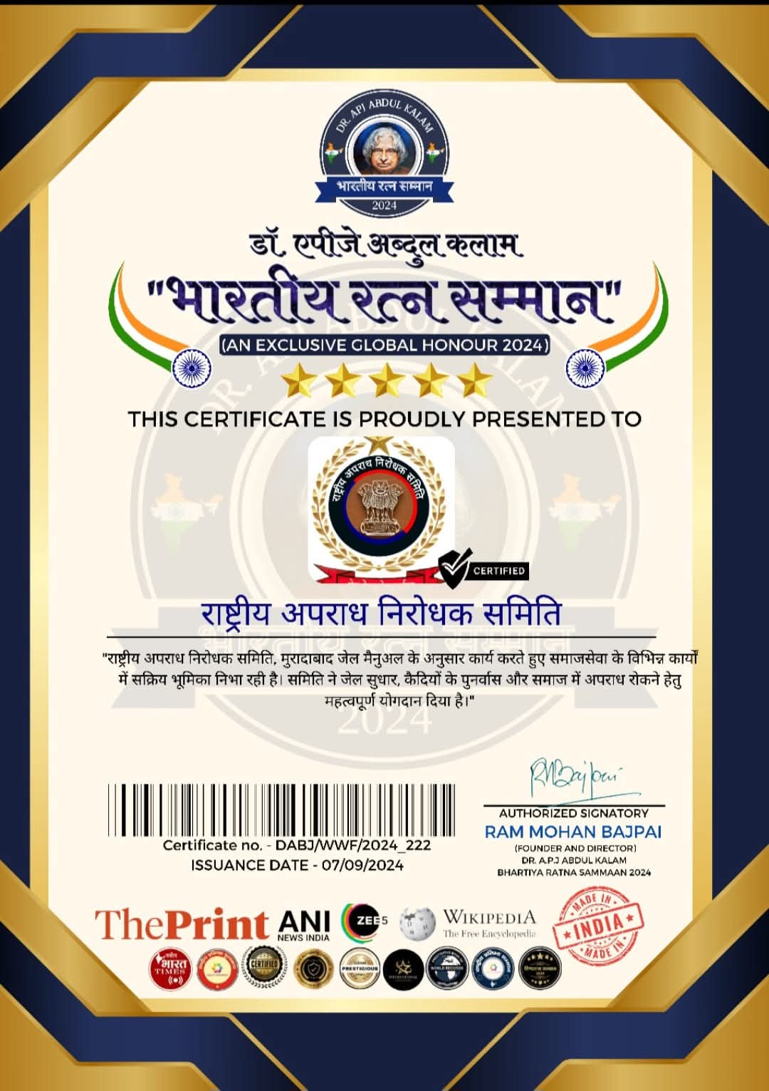 राष्ट्रीय अपराध निरोधक समिति का परिचय राष्ट्रीय अपराध निरोधक समिति संबंध : सामाजिक न्याय एवं अधिकारिता मंत्रालय भारत सरकार , नीति आयोग भारत सरकार, एम एस एम ई भारत सरकार , सी एस आर (1) भारत सरकार , आइ एस ओ सर्टिफाइड ISO9001:2015, Established under the Acts Of Government Of India) I.T.A. के द्वारा संचालित, आयकर अधिनियम १९६१ की धारा 80 जी (G) सहपाठित धारा 293 C नियम 11AA के अधीन छुट एवं धारा 12 ए के अधीन न्यास संस्था छुट देश में अपराध की रोकथाम के लिए कार्य करती है। इसका मुख्य उद्देश्य नागरिकों को सुरक्षा प्रदान करना, पुलिस व अन्य कानून प्रवर्तन एजेंसियों के साथ समन्वय स्थापित करना और अपराधों के खिलाफ निवारक उपायों को लागू करना है।